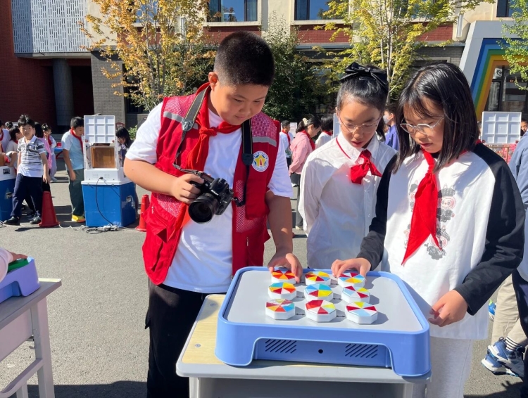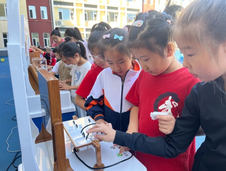 活動(dòng)現(xiàn)場(chǎng),18件“非物質(zhì)文化遺產(chǎn)”主題展品首次亮相,涵蓋光學(xué)、聲學(xué)、力學(xué)等科學(xué)原理和各種傳統(tǒng)文化知識(shí)。同學(xué)們敲擊青銅編鐘的不同部位能聽到兩種聲音,從煙花之炫中學(xué)到了不同金屬的焰色反應(yīng)。蘇繡展品介紹了飛針走線的不同手法,九針十二原介紹了針灸的相關(guān)知識(shí),學(xué)生們?cè)谡蛊非榜v足思考,積極操作,沉浸在直觀可感的科學(xué)世界中。10塊科普展板向同學(xué)們介紹了二十四節(jié)氣、苗族蠟染手工技藝、黃河大水車、油紙傘、漆器等古代勞動(dòng)者們的智慧結(jié)晶。